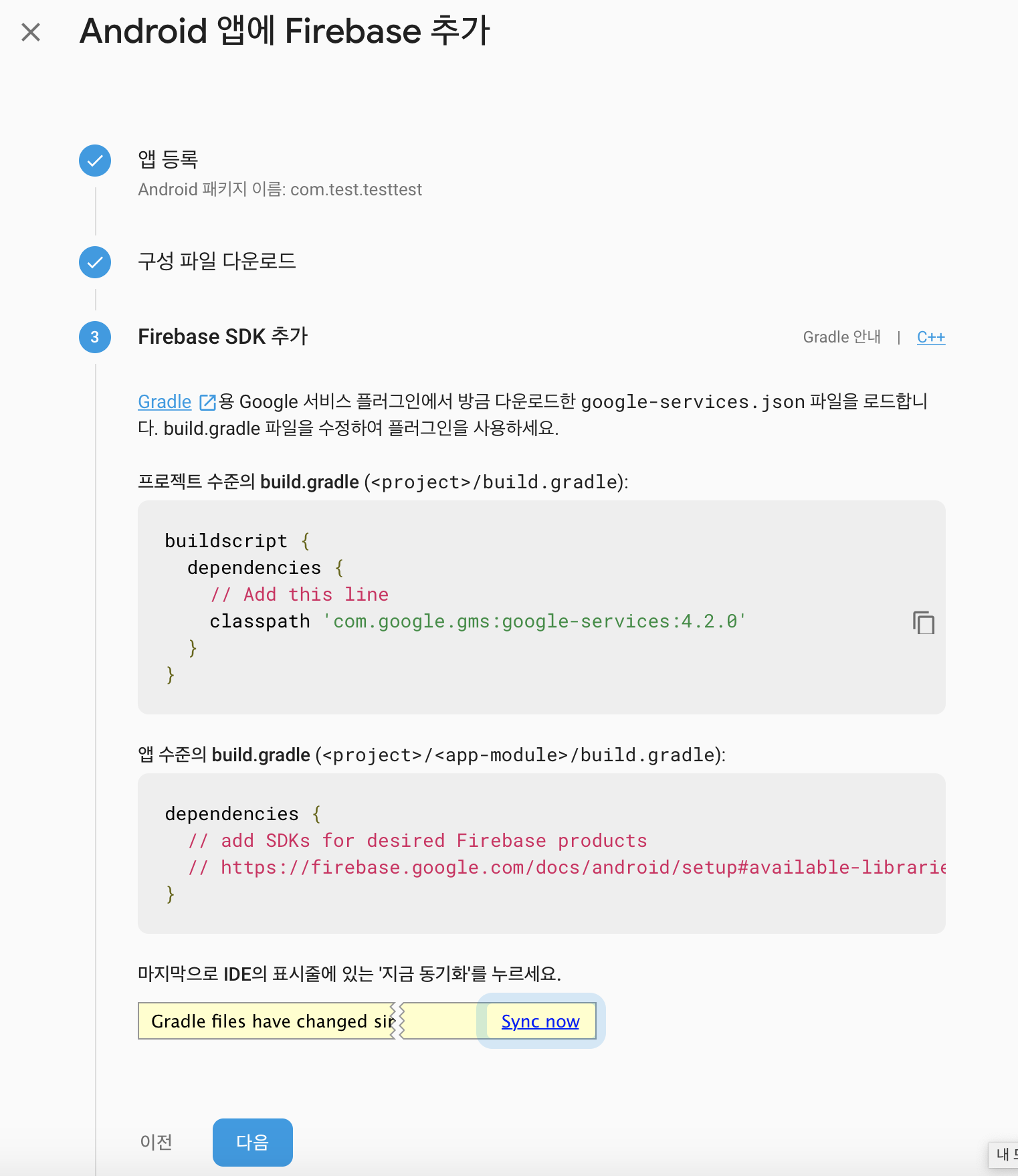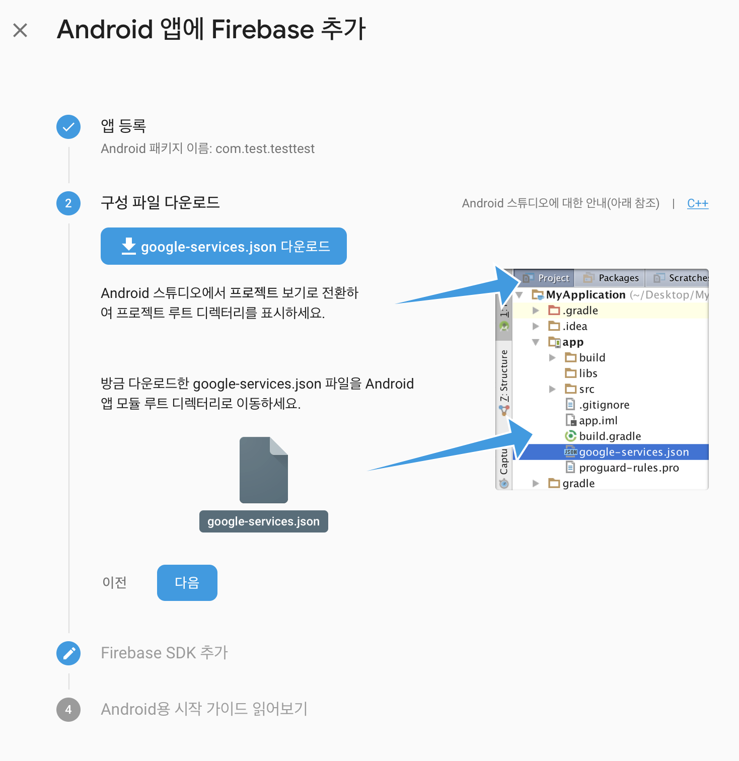 - google-services.json을 다운로드해서 app 폴더에 넣음