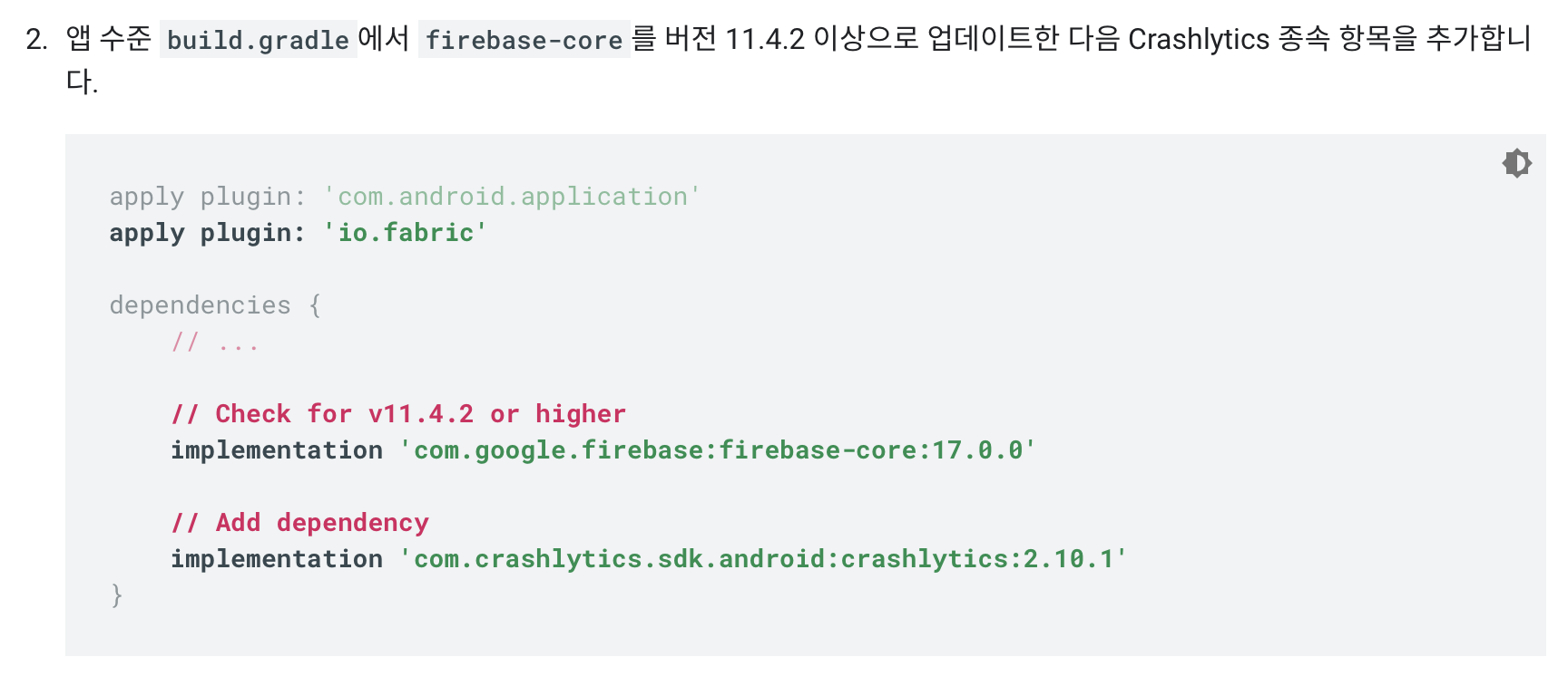 - Crashlytics는 전체 프로젝트 gradle과 해당 앱 프로젝트의 gradle을 수정하면 됨