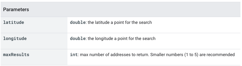 1. maxResults가 진짜 리턴하는 주소의 최대 개수라면 원래 위경도에 해당되는 주소 이름이 없기 때문에 현재 주소 개수가 maxResults값에서 1을 뺀 만큼만 나온다고 생각할 수 있다.