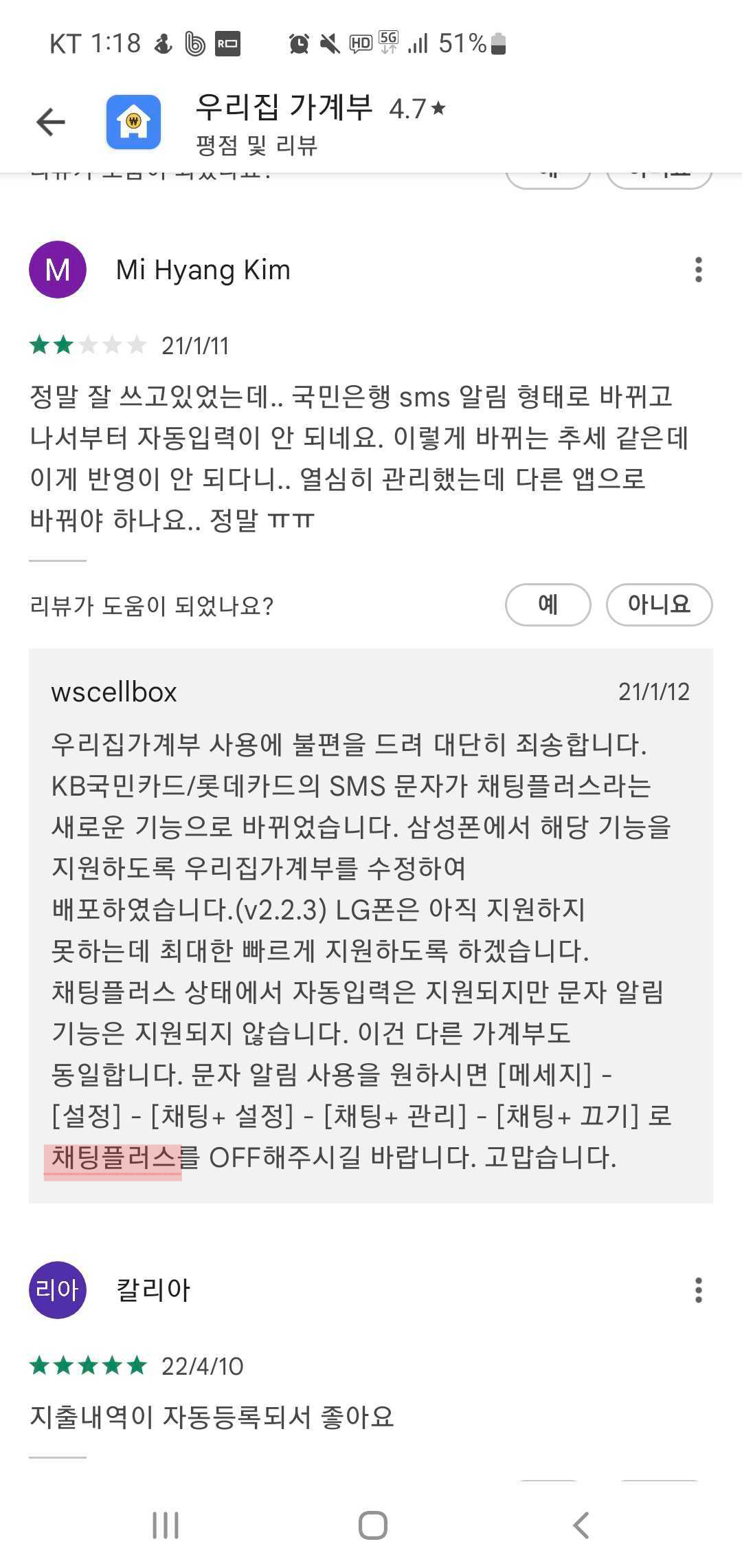 - RECEIVE_SMS 이벤트가 안 되는 삼성폰에서 채팅플러스 기능 비활성화시 RECEIVE_SMS 이벤트가 정상적으로 동작하는 것을 확인